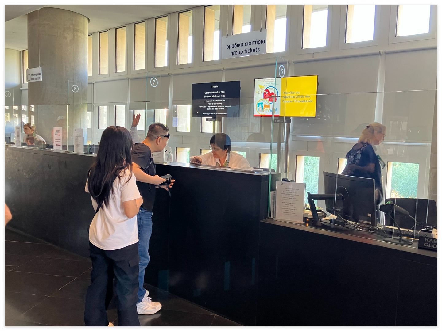 박물관 행정동 정문 – 대리석 담장 위로 "Εφορεία Αρχαιοτήτων Πόλης Αθηνών" (아테네 고고학 감독청) 글씨가 보인다박물관 옆길 풍경 – 현대식 유리 박물관 건물과 고전적인 벽돌 건물이 나란히 서 있는 좁은 산책로아크로폴리스 박물관 입구에서 입장권을 끊는 순간